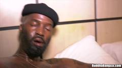 Essa vagabunda de pele negra sacode a bunda gorda e a cobre de óleo, chupa o pau enorme de um cara e o toma.