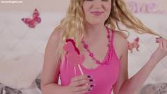 Esta jovem loira chupa uma bengala doce e se despe