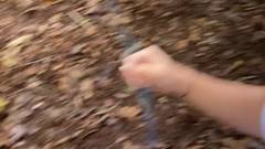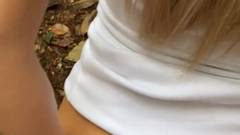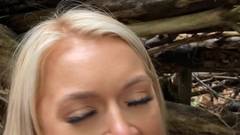 Uma loira safada chupa um pau ao ar livre e é fodida no estilo doggystyle. Ela implora para gozar, de joelhos.