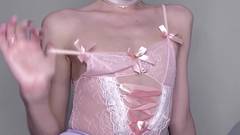 Mais uma vez você vai se excitar com a visão dessa morena trans. De meias brancas, com as bolas grandes perto da câmera