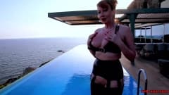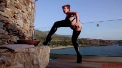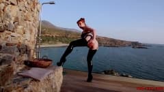 Uma ruiva britânica madura, vestida com uma roupa de látex, masturba sua buceta na varanda.
