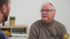 Megan Love, loira, se oferece a um velho verde no sofá. Sob o olhar do seu namorado, ela chupa, cavalga de vaqueira e de quatro, engolindo uma ejaculação.