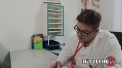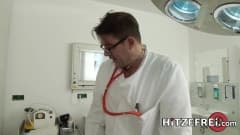 Uma loira alemã madura foi ao ginecologista. O médico ficou tão excitado enquanto a examinava que massageou seus seios grandes e a fodeu até gozar nela!