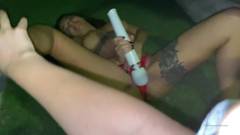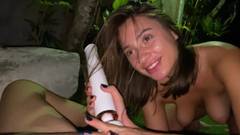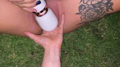 Jia Lissa e sua namorada estão no jardim. A lésbica está usando um vibrador, lambendo sua buceta e acariciando seus seios grandes.