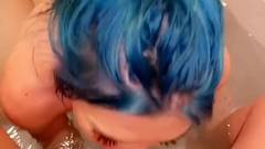 Uma beldade de cabelos azuis e uma modelo de webcam morena com tatuagens lambem a buceta e a bunda uma da outra dentro de uma banheira.