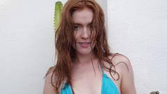 Gia Lissa, uma ruiva sexy, tira lentamente seu biquíni e mostra seus peitos pequenos e sua buceta para a câmera! Divirta-se!