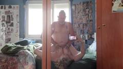 Esse homem idoso usará as tetas de sua esposa.