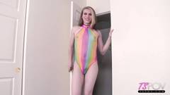 Izzy Wilde, uma garota trans com um maiô colorido, se ajoelha nesse filme POV e chupa como uma profissional o pau gordo e ereto que está na sua frente.