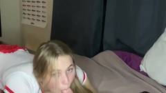 Uma web bombshell loira, bdsmbelle chupa o pau do seu homem na frente da câmera e fica de frente para ele. Ele lambe a buceta dela e ela acaba se masturbando.