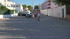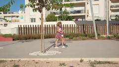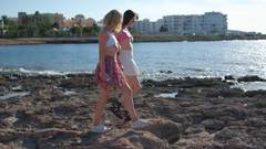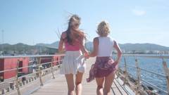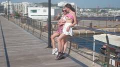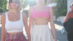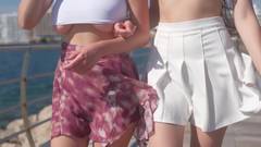 Jovens lésbicas, uma ruiva e uma loira, passeiam pela praia e pela cidade exibindo seus grandes seios e nádegas em suas minissaias que parecem muito sensuais.