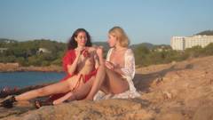 Neste vídeo, uma morena e uma loira, Alissa e Mila, andam de mãos dadas com os peitos e a buceta de fora. Elas se sentam e podemos ver como são apertadas.