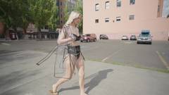 A jovem loira usa apenas calcinha. Ela cobre seu corpo curvilíneo com um casaco transparente e caminha pelo calçadão, para que todos possam ver seu corpo.