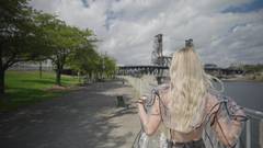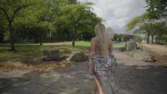 Uma jovem loira caminha nua pelo calçadão do parque para se exibir