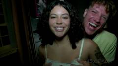 Essa morena veio se encontrar com seu amigo! Ele acaricia seus peitinhos e depois se abaixa para tocar sua buceta! Ela então se ajoelha e engole o pau dele.