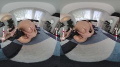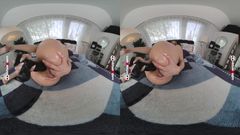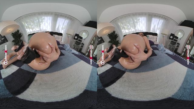 Emily Pink se despe e enfia um grande dildo negro. Ela o introduz em todos os seus buracos, boca, buceta e cu. Depois começa a foder-se com o punho em VR.