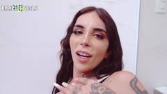 A trans se envolveu com dois caras que penetram seu cu e sua boca