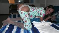 Ela massageia o namorado e dobra o pênis para colocá-lo em seu ânus.