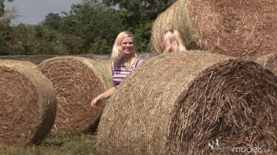 Um belo vídeo com uma grande sessão de verão no meio da natureza! Duas adolescentes loiras decidem apreciar a paisagem no meio dos fardos de feno!