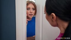 Money Birdette, amante de esperma, compete com Lucy Foxx pelo pênis de Ethan, ambas fazendo boquetes e lutando para engolir sua carga em um trio.