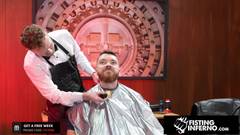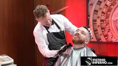 O barbeiro enfia o braço no traseiro de seu cliente favorito