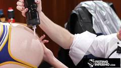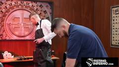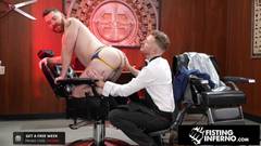 Depois que o cabelo é cortado, esse homem só tem uma maneira de pagar. Ele tem que ficar de pé na cadeira com a bunda bem aberta para que o barbeiro possa aproveitar