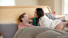 Steve Rickz está na cama observando a transexual Ember Fiera tomando banho de sol. Ela vai para a cama com ele e, depois de beijá-la, ele chupa seu pau.