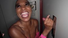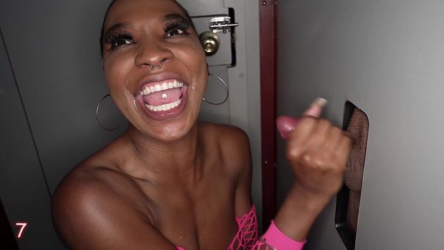 Desde que esta linda negra chegou ao quarto dos buracos, ela tem estado ansiosa para ver se sai uma pila e umas bolas que estejam cheias de sêmen para a cara dela.