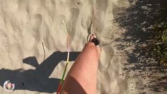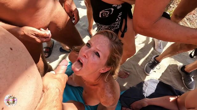 A joelhos na areia, ela se encontra rodeada de várias picas que a enchem a boca por turnos, ejaculam uma a uma sobre seu rosto sob a luz do sol!