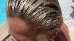 Estou certo de que qualquer homem gostaria de poder estar na piscina com uma loira como esta, que sabe mamar um pau como uma profissional do sexo.