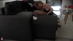Loira de lingerie é fodida na sala de estar em uma webcam escondida