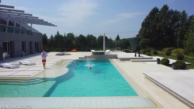 Uma linda garota excitada com peitos grandes e perfeitos e um corpo musculoso é destruída por seu treinador durante o treino de natação. Ela adora esperma