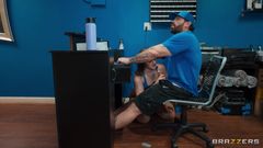 Joey, funcionário de uma academia, recebe favores sexuais de membros excitados, tem seu pau grosso chupado e uma buceta preta devorada.