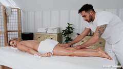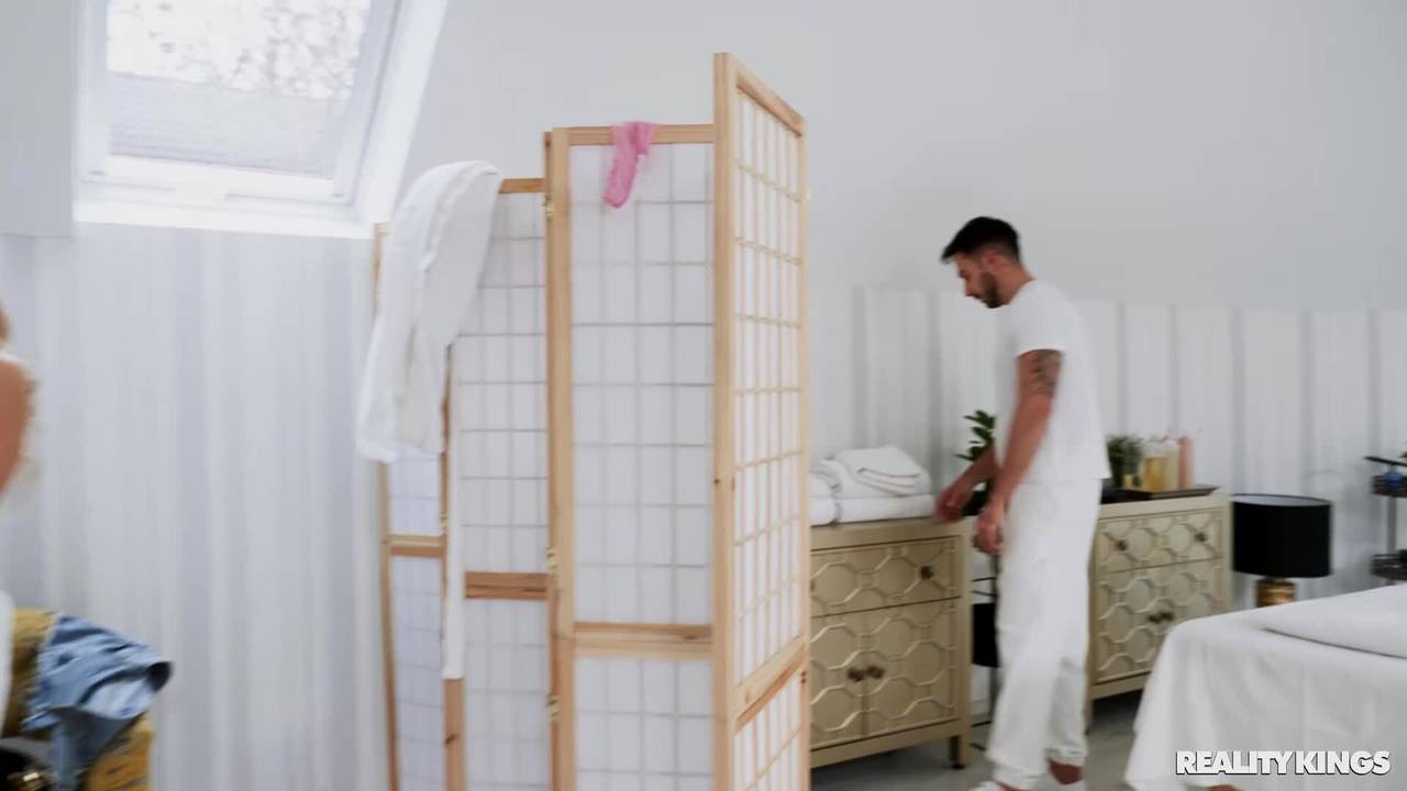 A loira Maya Rose fica nua para o massagista Francis X, que esfrega seus peitos e sua buceta com óleo. Ele chupa o pau dela e passa os dedos em sua buceta.