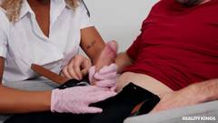 A paramédica Sky Alexis examina seu paciente Jmac, olhando para seu enorme tesão. Ela chupa o pau dele, chupa sua bunda e o quer dentro de sua buceta apertada.