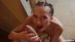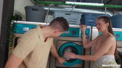 Stacy Cruz flerta com Jimmy Bud na lavanderia, mostrando seus peitos para seduzi-lo. Ela chupa o pau dele no banheiro e depois é fodida pelas lavadeiras.