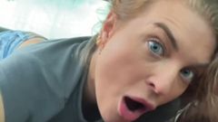 Uma loira faz um boquete em um carro no meio do nada! Quando ele está prestes a gozar, ela tem que sair para não sujar o carro!