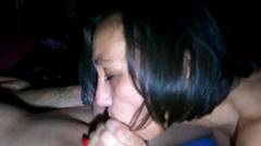 Uma puta morena está no meio de dois caras, chupando pau e sendo fodida por trás no estilo cachorrinho! O cara goza e ela lambe tudo.