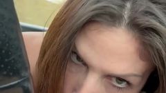 Essa MILF está com tesão, mas seu homem está dirigindo. Ela o provoca, se masturba e usa um brinquedo sexual, depois puxa o pênis dele e começa a chupá-lo, esperando que ele a foda.