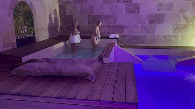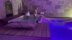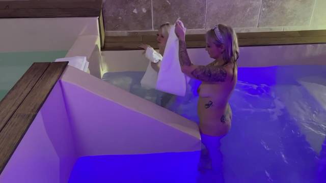 Para se excitarem muito, estas duas loiras vão se beijar e se tocar dentro da piscina, já que seus corpos molhados as excitam muito mais para o porno.