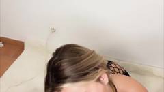 A loira nem sequer tira a lingerie para ser fodida! Ela é fodida por trás, na buceta e no cuzinho. Depois, ela o chupa até que ele goze em seu rosto.