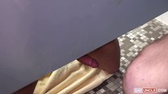 Esse valentão grava em vídeo um garoto se masturbando no banheiro da universidade. Ele tira o pênis para fora e o mostra embaixo do vaso sanitário para que o garoto o chupe.