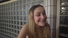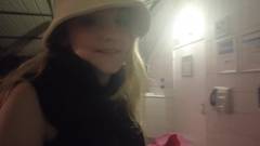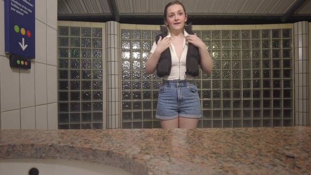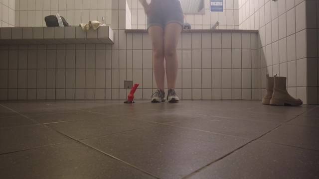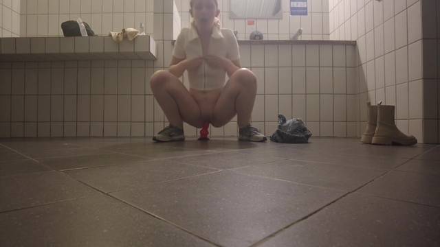 Ela não precisa de um lugar especial para se masturbar com seus dildos, em qualquer banheiro público ela se despe e se grava enquanto enfia seus brinquedos sexuais.