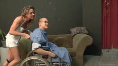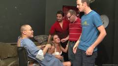 Uma Milf loira com mamas pequenas que vai transar com todo o caras que lhe aparece. Um gangue bangue maluco seguido de um bom bukkake.