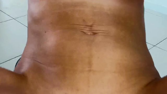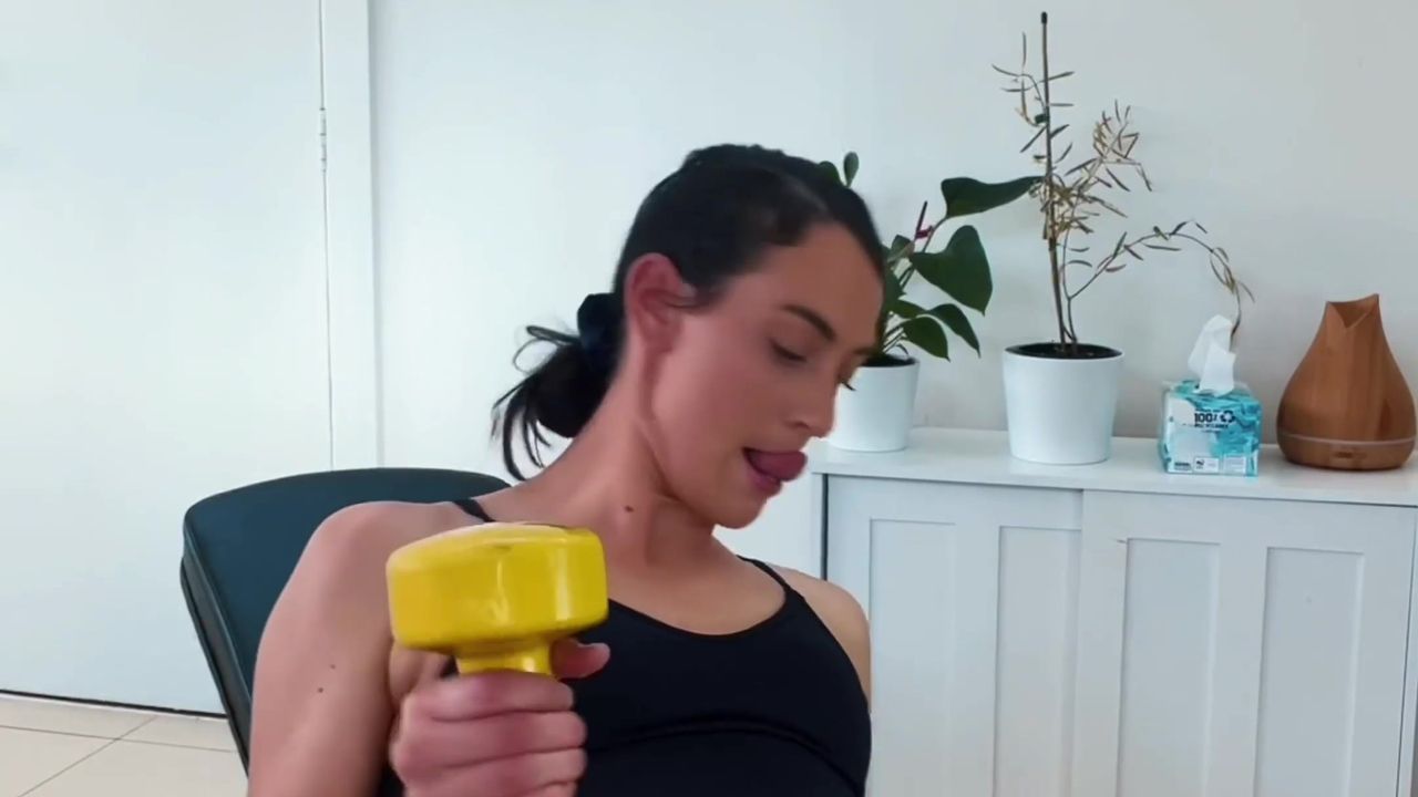 Ao começar a fazer exercícios, ela se despe e se masturba com brinquedos
