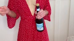 Uma morena que adora beber champanhe e urina para se excitar sozinha