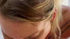 Esse cara sabe que essa loira é uma chupadora de pênis profissional e é por isso que ele vai filmá-la em POV enquanto ela chupa toda a sua porra.