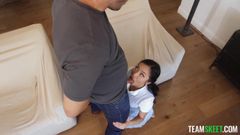 Esta linda asiática é Avery Black, e se ajoelha como ele lhe pediu e começa a chupar seu pau grosso e branco para fazê-lo feliz