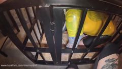 Mesmo em uma gaiola, ele transa com esse cara subjugado e amarrado.