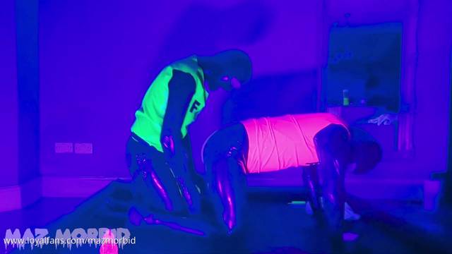 Um casal praticando BDSM anal sob luz ultravioleta
