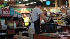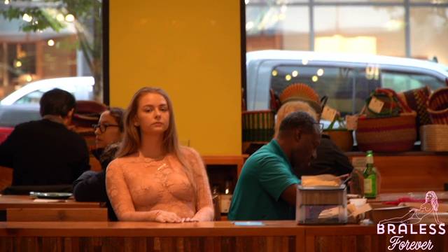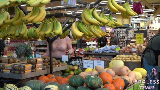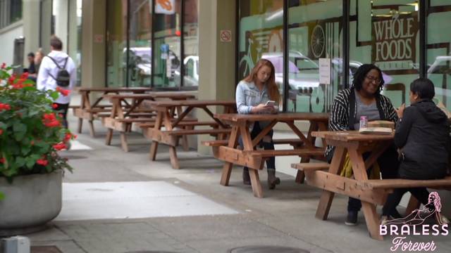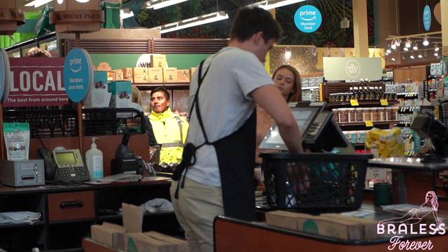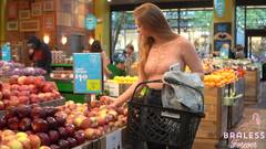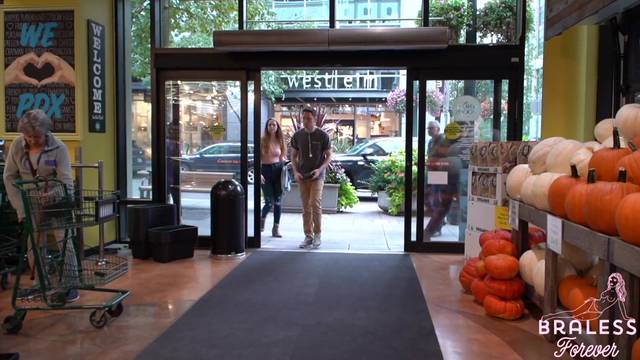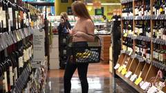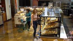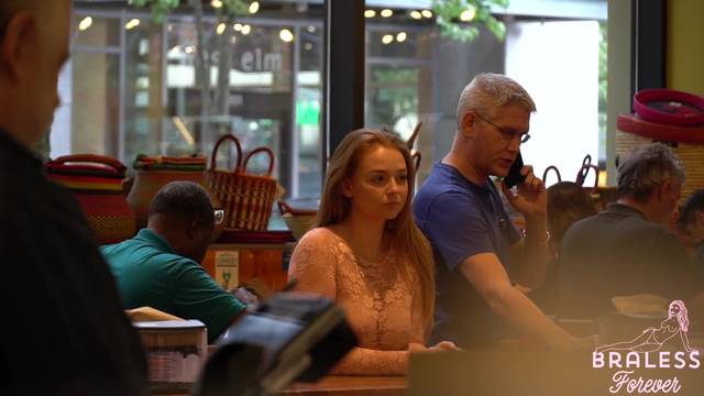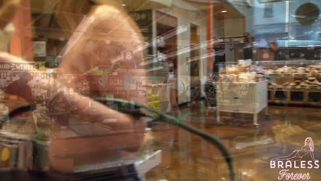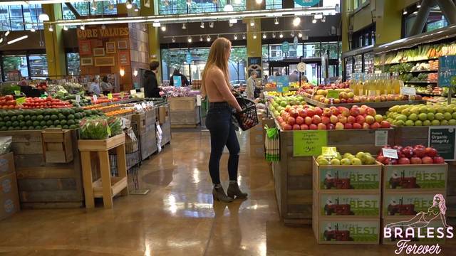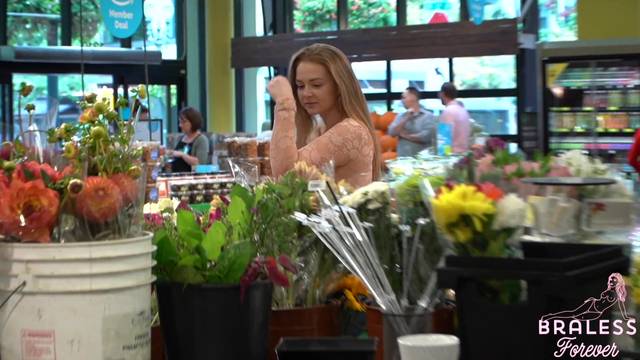 É possível ver seus seios através da blusa quase transparente que ela está usando. Ela é uma exibicionista e é por isso que gosta de fazer compras assim, sem problemas.